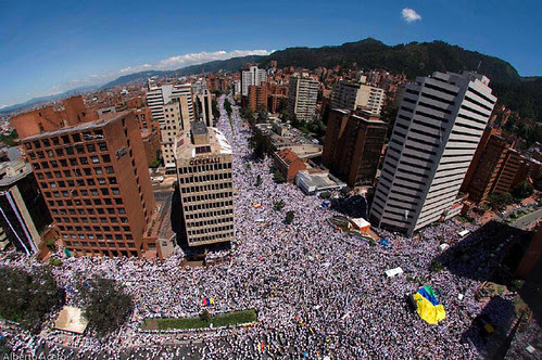 The February 4th pro-peace anti-FARC march in Colombia was a direct reaction to President Chavez' appeal to the international community which asked for the FARC to be taken off the list of terrorists. Colombians won't stand for it. Millions of protesters all around the world gathered peacefully with signs like the one above, proclaiming, "yes, they ARE terrorists". 5 million people marched in Colombian cities alone, which is over 12% of the entire population, and simultaneous marches were carried out in over 165 cities around the world. CNN reported that "thousands" had marched. Let's be clear about the difference between "thousands" and "millions".
